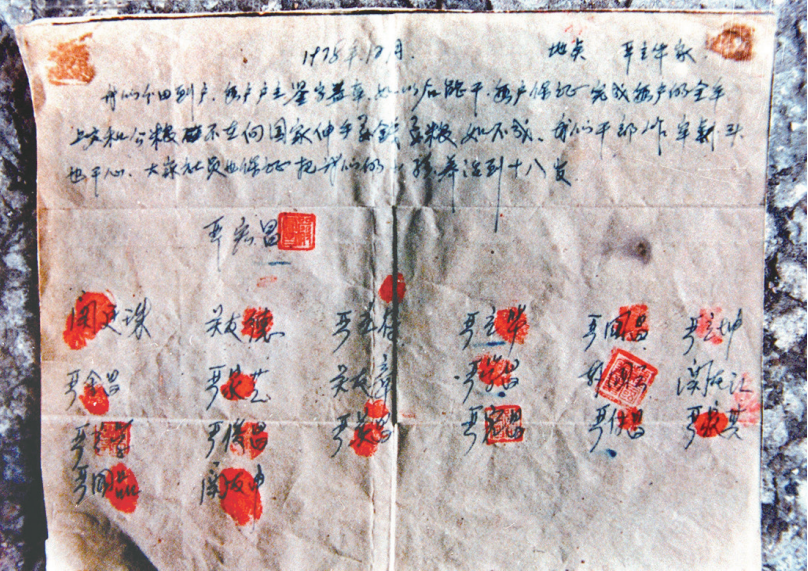 △安徽凤阳小岗村农民摁上红手印的包产到户契约