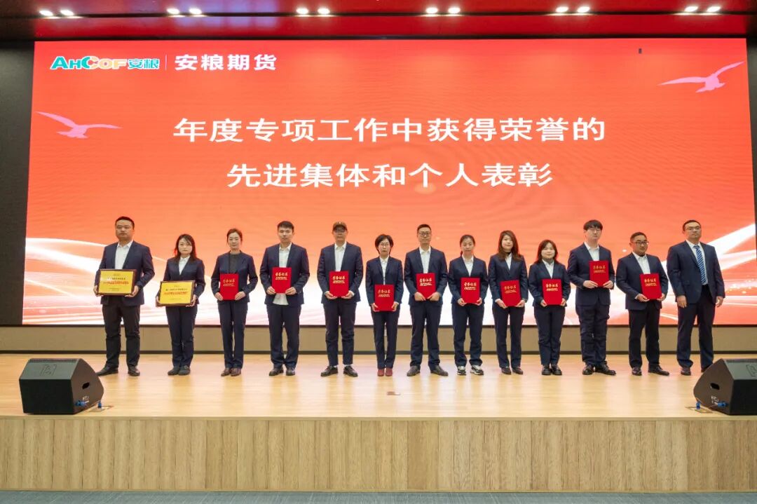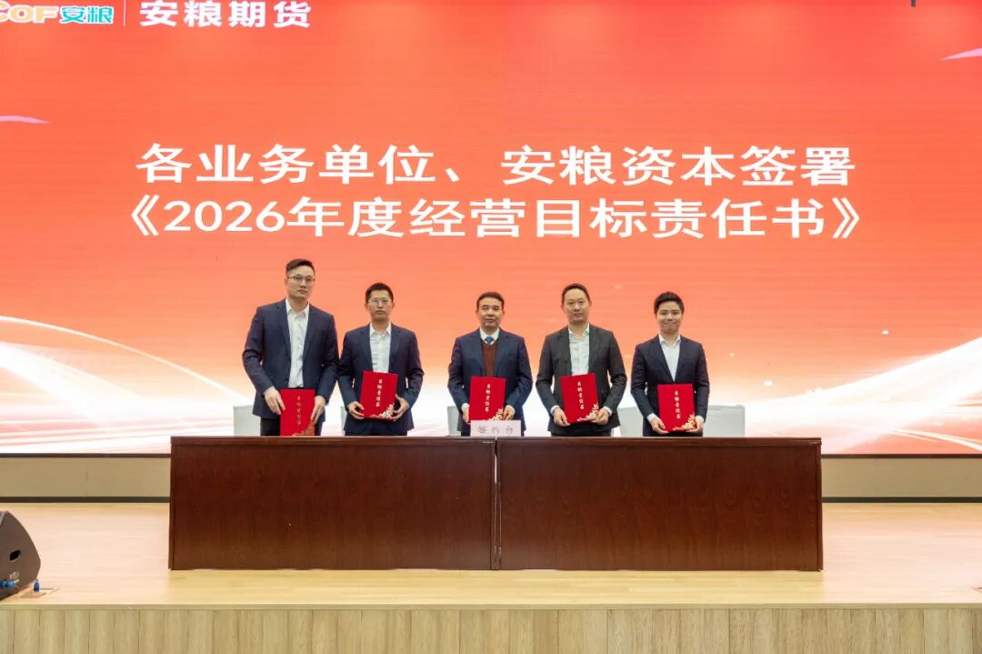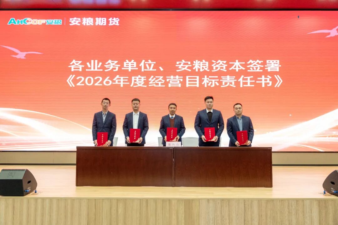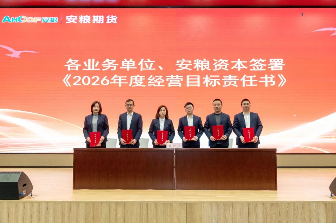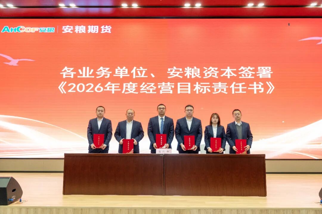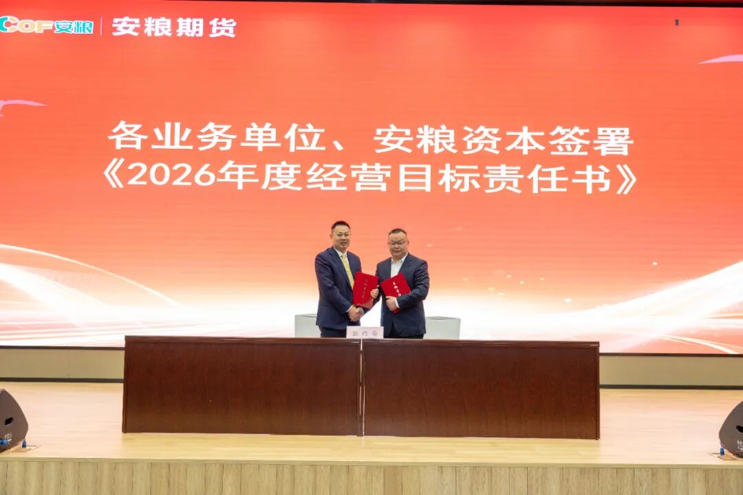 3月6日,安粮期货召开2026年工作会议暨职工(工会会员)代表大会。会议全面传达上级单位年度工作会议精神,表彰2025年度优秀集体和先进个人,系统部署2026年各项重点工作任务。安粮集团党委委员、副总裁、总会计师杨荣山出席会议并讲话。会议首先对2025年先进集体和个人进行现场表彰,获奖代表上台发言,分享了自己在工作中的实践经验、成长感悟与奋斗心得。随后,公司经营班子成员分别与分管业务单位签订2026年经营目标责任书,明确目标、压实责任,为全年工作落地见效奠定坚实基安粮集团党委委员,安粮期货党委书记、董事长、总经理韩文辉作了题为《笃行不怠担使命 守正创新促提升》的工作报告。报告全面回顾了2025年公司各项工作成效,明确了2026年工作总体思路,坚持稳中求进工作总基调,锚定中长期发展目标,推动各板块协同发力,深度融合,提升公司核心竞争力,为“十五五”时期高质量发展筑牢根基。安粮集团党委委员、副总裁、总会计师杨荣山在总结讲话中,对安粮期货2025年的工作给予充分肯定。同时,他希望全体员工准确把握发展大势,以更加坚定的信念、更加务实的举措,在新的起点上攻坚克难、实现新突破。针对安粮期货未来改革发展,杨荣山提出五点要求。一是坚守定位,深耕主业,全面提升服务实体经济质效。二是强化风控,坚守底线,确保公司行稳致远。三是勇于创新,锐意进取,培育高质量发展新动能。四是协同联动,融入大局,助力集团整体战略实现。五是党建引领、凝心聚力,让红色成为安粮期货最鲜亮的底色。
