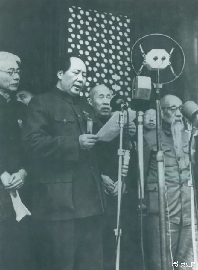 开国大典。1949年10月1日,毛泽东在天安门城楼上庄严宣告:中华人民共和国中央人民政府今天成立了!