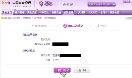 5、在期货公司中,选择“安粮期货”,输入期货资金账号和银行卡密码,点击“下一步”,再次确认期货公司名称和期货资金账户,并点击提交