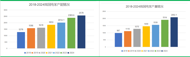 中国纯苯市场整体供给呈现持续扩容态势。近年来行业产能规模快速提升,据钢联数据显示,国内纯苯产能从2017年的1247万吨增至2024年的2578万吨,七年间实现翻番增长。分阶段来看,2023年产能增速高达近20%,为近年峰值,2024年增速虽有所放缓至7%左右,但仍保持稳健扩张。产量端同步实现增长,2024年达2092.1万吨,较2017年的849.5万吨增长146%,其中2023年产量同比增幅达23%,显著高于2024年9.4%的增速,反映出前两年行业处于集中释放期。