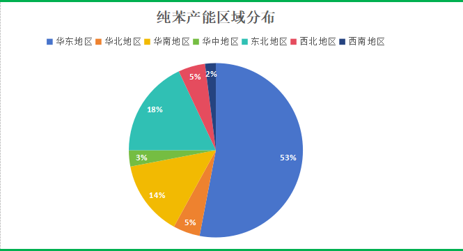 从供给主体看,2023年国内纯苯生产企业超70家,新增产能主要来自宁波大榭石化、广东石化、海南炼化等大型项目,以及中海油惠州二期、山东利华益、龙江化工等装置投产,这些新增产能有效推动整体产量显著提升。值得注意的是,行业内多数企业规模偏小,产能布局以配套下游装置为主,形成“炼化-纯苯-下游深加工”的一体化生产模式,这种配套化生产特征在一定程度上稳定了产业链供需关系。从国内纯苯产能分区域来看,华东地区产能最集中,2024年占比达到53%。华东地区因其良好的水运及陆运条件,吸引大量国内大型炼化一体化装置项目落地。同时但该区域亦是国内纯苯的主要消费地区,装置更贴近下游消费市场,物流成本低,便于原料及产品的运输与销售。东北地区产能占比约18%。东北地区石油资源相对丰富,是我国重要的石油化工产业基地之一;中石油旗下多家炼厂分布于此。且东北地区与华北地区在产业联系上较为紧密,交通网络便捷,有利于纯苯产品的运输和销售。华南地区产能排名第三,占比14%;伴随广石化等大型炼化装置落地,有力的推动了区域纯苯产能的增长。此外其余区域比重相对较少,均不超过5%。