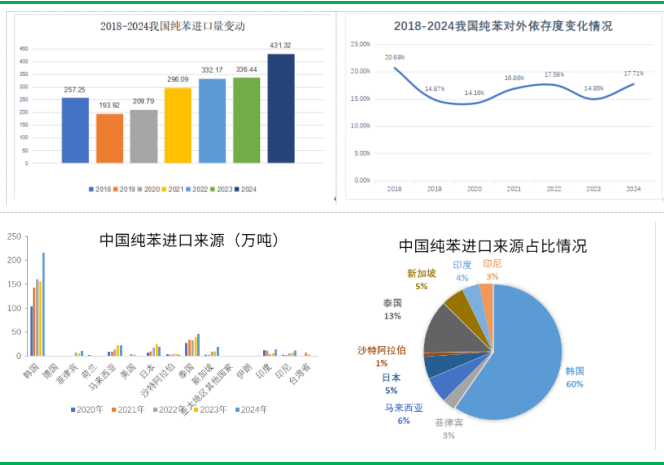 作为纯苯净进口国,中国的纯苯出口量长期维持在极低水平,2024年出口量仅0.025万吨,几乎可以忽略不计。尽管国内纯苯供给规模持续扩大,但下游市场需求增长更为强劲,国内产量始终难以满足实际需求,使得海外货源成为中国纯苯供应体系的重要组成部分。海关数据显示,近年来中国纯苯进口量始终保持在190万吨以上,并自2020年起呈现明确的逐年递增趋势:2023年进口量达336.44万吨,同比增长1.29%,对外依存度攀升至14.95%;2024年进口规模进一步扩大至431.3万吨,同比增幅达28.21%,对外依存度也随之提升至17.71%,持续高于14%的长期水平。2019-2024年期间,中国纯苯进口量整体保持增长态势,反映出国内供需缺口的持续存在与进口依赖度的阶段性加深。从进口来源来看,韩国纯苯进口量215.7万吨,占比达60%,其次是泰国、马来西亚和新加坡等。韩国是全球纯苯主要出口国,2024年韩国纯苯出口总量305.1万吨,主要流向中国和美国,占比分别为70.7%,19.8%。