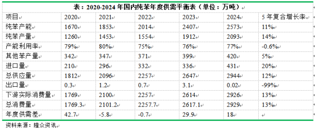 2024年我国纯苯总供应量为2944万吨,构成包括自产2093万吨与进口431万吨;全年表观消费总量为2926万吨,整体市场维持供需平衡状态。但由于中国纯苯产业链各品种的不均匀发展,导致了行业供需差异化发展,供需基本面成为纯苯行业判断价格波动的重要标准,被市场频繁交易。