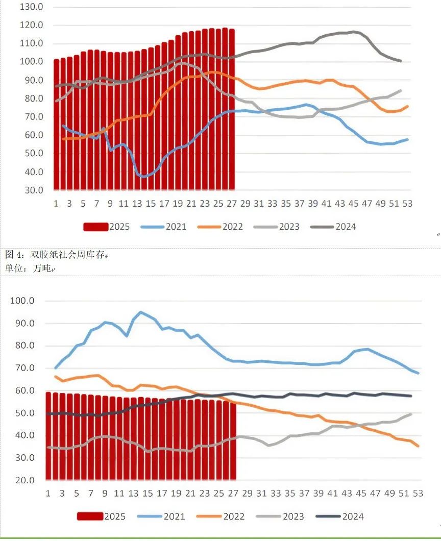 双胶纸库存主要分为企业库存与社会库存两类,分别反映生产端与流通端的供需状况。企业库存由造纸企业直接持有,波动较为敏感,受生产节奏与短期需求影响较大;社会库存则包括贸易商、下游印刷厂等中间环节,规模更大,波动相对滞后,体现市场整体供需平衡。回顾近五年,双胶纸的企业库存基本在40-120万吨之间;双胶纸的社会库存在30-100万吨之间。相对国内千万吨左右的产量和消费量,库存水平总体处于正常水平。