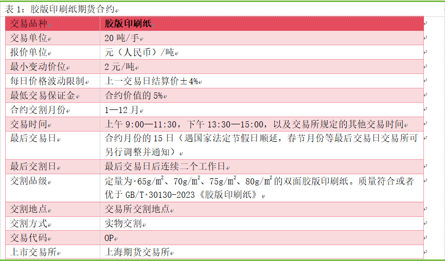 胶版印刷纸期货合约的设计遵循核心原则,力求与现货市场紧密衔接,以期精确映射胶版印刷纸市场的实际运行状况。合约条款与条件的设定,旨在真实再现现货市场中胶版印刷纸的交易特性,为市场参与者提供一个可靠的定价与交易基准。具体合约要素如下:交易品种为胶版印刷纸,交易代码为 OP;交易单位为每手20吨,报价单位为人民币元/吨;最小变动价位为每吨2元,每日价格波动限制为上一交易日结算价的±4%;最低交易保证金为合约价值的5%,合约交割月份覆盖1月至12月。最后交易日定于合约月份的15日(如遇国家法定节假日则顺延,对于春节等特殊情况,交易所将另行调整并通知),最后交割日为最后交易日后的连续两个工作日。交割品级为定量65g/m²、70g/m²、75g/m²、80g/m²的双面胶版印刷纸(其质量需符合或优于GB/T 30130-2023《胶版印刷纸》标准),交割地点为交易所指定的交割地点,交割方式为实物交割,该合约在上海期货交易所上市交易。