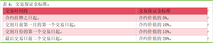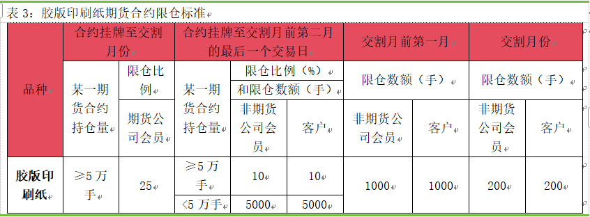 胶版印刷纸期货合约每日涨跌停板幅度为前一交易日结算价的±4%。胶版印刷纸期货合约最低交易保证金标准为合约价值的5%。胶版印刷纸期货合约交易保证金标准见下表: