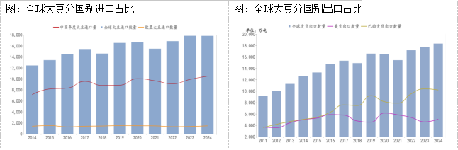 全球大豆进口高度集中,主要进口国家:中国、欧盟、墨西哥等。中国近些年进口大豆年均数量约1亿吨,占比全球大豆年均总进口量近60%,是全球大豆核心进口市场。欧盟年均进口量约1500万吨,占比全球进口量9%。核心用于畜牧业饲料,德国、西班牙、荷兰是主要消费国。墨西哥年均进口量约700万吨,占比全球进口量4%。高度依赖美国,凭借地理优势降低运输成本、保障供应稳定。全球大豆出口以美国、巴西、阿根廷三国为主,呈现“巴西主导、美国份额收缩”格局。三国出口总份额占比全球总出口90%以上,中国是三国最核心的出口去向。凭借种植面积扩张和产量优势,巴西自2012年起出口量持续超过美国,且份额逐年提升。