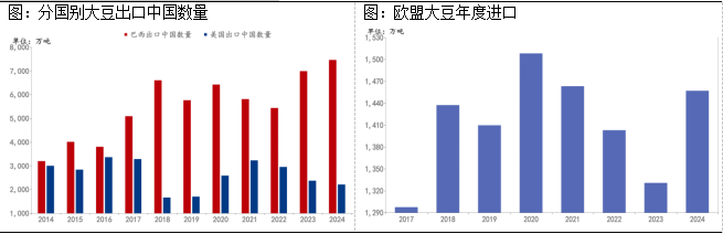 中国是全球最核心的大豆进口国,每年进口量约1亿吨,主导大豆贸易格局。2014年前中国主要进口美豆为主。为摆脱对美豆的单一依赖,中国采购重心逐渐转移至南美地区。2014年后中国从巴西进口数量超越美国,进口量不断增加。2024年中国进口巴西大豆数量7464.73万吨,美豆数量2213.39万吨,比例约3:1。2025年中美贸易关税背景下,中国加大对巴西大豆的采购。25年1至10月中国占到巴西大豆出口量的79.9%,高于74%的历史均值。欧盟也是重要的大豆进口地区之一,2024/25年度欧盟进口大豆1452万吨,同比提高9.54%,主要从巴西、美国、乌克兰三个国家进口。