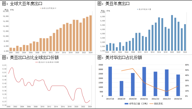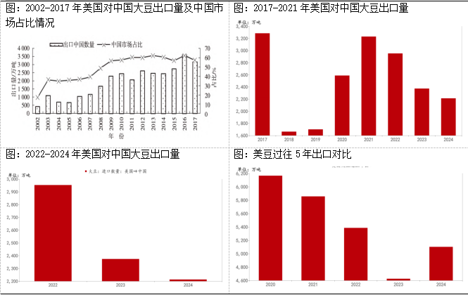 2002-2017年:自中国加入WTO后,大豆市场深度放开,使得具有较强竞争优势的美国大豆快速占领中国市场。大豆需求的释放,迅速拉动美豆出口量。根据相关数据显示,在2002-2008年,美国大豆以年均25.2%的增速出口中国市场。该时期美国对中国出口大豆占其出口总量的比重由2002年的17.3%快速提升到2008年的48.8%。2009-2017年,美国出口中国大豆数量总体呈持续攀升态势,每年对华出口量占美国大豆出口总量的60%左右,双边贸易依存度较高。2018-2021年:2018年4月3日,美国公布首份对华加征关税清单,涉及约500亿美元中国商品。中国迅速宣布对等报复措施,涉及同等规模的美国商品。随着中美经贸摩擦紧张关系的加剧,2018年7月6日、8月23日,中国政府决定对原产于美国的大豆等进口商品对等加征25%的关税。自此,中美双边大豆贸易关税税率大增,原本前景良好的贸易往来也因中美经贸摩擦的开始而发生急剧转变。2018年中国进口美豆数量急剧下滑,同比2017年减少近50%。一直到2020年中美两国在白宫签署第一阶段贸易协议,中方承诺加大对包括美国大豆在内的农产品采购。随后中国对美豆进口逐渐恢复以往水平,2021年进口美豆3231万吨,基本与17年的进口数量持平。2022-2024年:虽第一阶段签订协议,但中美在各个产业贸易摩擦不断。2022年美国通过《芯片与科学法案》和《通胀削减法案》,对半导体、清洁能源等领域提供巨额补贴,限制相关企业对华投资,以及升级半导体出口管制,限制中国获取先进芯片制造技术。2024年,中方加强对稀土出口方面的管制,特朗普在社交媒体上表示要大幅提高中国商品的关税,回应中国的稀土出口管制。2022到2024年,美豆出口数量逐年下滑,2024年美豆对华出口2213万吨,相较2022年出口量2953万吨减少25.05%。2025年:2025 年美国政府实施新一轮对华关税调整,在额外关税加征的背景下,中国暂停新季美豆采购。10月末,中美经过多轮谈判,相互取消10%的“芬太尼关税”并延长对等关税减税一年。美财长贝森特表示双方就大豆贸易达成了可量化的“数量+期限”式框架:中国将在截至明年1月采购1200万吨大豆,并承诺在未来三年每年购买2500万吨。在乐观情况下,美豆依旧保留13%的关税,与南美大豆相比仍缺乏价格竞争力。商业买船难以发生,进口美豆大概率属于非关税豁免下的政策性采购行为,关注后续实际采购节奏。