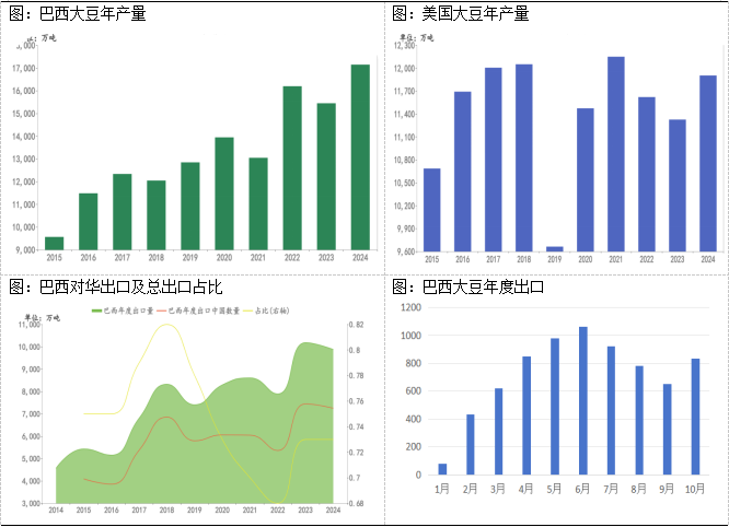 中国通过巨额投资和资源倾斜,协助巴西提升大豆生产能力,显著改变了美国在大豆贸易中的主导地位。2015/16年度巴西大豆产量为9570万吨;而到了2025/26年度,巴西产量预计将达到创纪录的1.776亿吨。同期美国产量却停滞在1.16亿至1.17亿吨左右。同时中国加大对巴西农业基础设施的建设与投资,根据有关报道,中国已投入数亿美元用于改善巴西的港口设施和铁路系统。例如,中粮集团正投资2.85亿美元在桑托斯港建设新的农产品出口码头,年吞吐量从450万吨提升至1400万吨。中国交通建设集团上海航道局巴西公司多年来负责巴拉那瓜港的清淤维护和基建疏浚工作,使该港最大通航船舶从5万吨级升至10万吨级。中国对巴西港口的建设布局大幅提高了农产品的运输效率。相比美国大豆,巴西大豆价格更低,含油量和蛋白含量略高,且杂质含量明显低于美国大豆。总体上看,在正常贸易环境下,进口巴西大豆的经济效益要略好于美国大豆。在近些年中美贸易摩擦背景下,中国进口重心由美国转移至南美地区(巴西),叠加产能的提升以及运输效率的改善,巴西出口量逐年稳定上升,从2018年7488万吨增长至2024年1.03亿吨,增幅37.55%。当前巴西已取代美国成为全球第一大豆出口国,同时也成为中国的头号大豆供应国家。在2025年中美贸易博弈加剧之下,美豆因加征关税原因缺乏竞争力,同时中国买家因避险问题加大对巴西大豆的采购。2025年1-10月巴西大豆出口量达到1.02亿吨,其中巴西对华出口大豆占巴西大豆总出口的比例为79.9%。9月末阿根廷政府宣布暂免出口关税,中国买家随即采购约266万吨大豆,船期在美豆出口窗口期间,此举进一步冲击美豆出口份额。